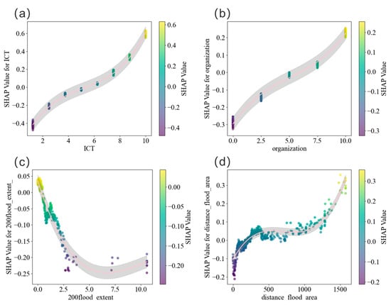 As shown in Figure 3a, communication technology exhibits a generally positive correlation with the level of residents’ participation, characterized by a distinct threshold effect. When the communication technology score is below 4, its impact on participation level is negative (SHAP value < 0). As the score increases from 4 to 7, the positive impact grows slowly. However, beyond a score of 7, the positive influence is significantly enhanced. A plausible explanation is that advanced communication capabilities expand the scope and speed of information dissemination, allowing residents to rapidly synchronize flood-related information. This can foster a “sense of controllability” over the situation, which in turn significantly promotes their level of engagement in relief efforts.