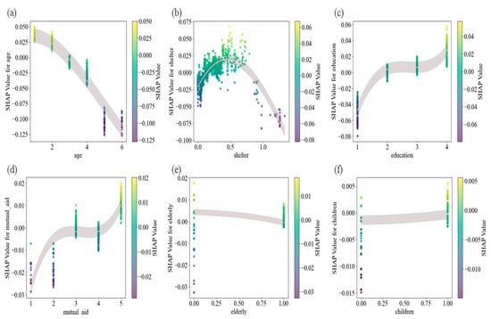 To interpret the non-linear relationships captured by the GBDT model, this study utilizes SHAP values to generate dependence plots for each independent variable against residents’ participation in disaster relief. In these plots, the X-axis represents the value of an independent variable, while the Y-axis represents its corresponding SHAP value, indicating the magnitude and direction of its impact on the model’s prediction for participation level. The trend line reveals the complexity and non-linearity of these relationships.