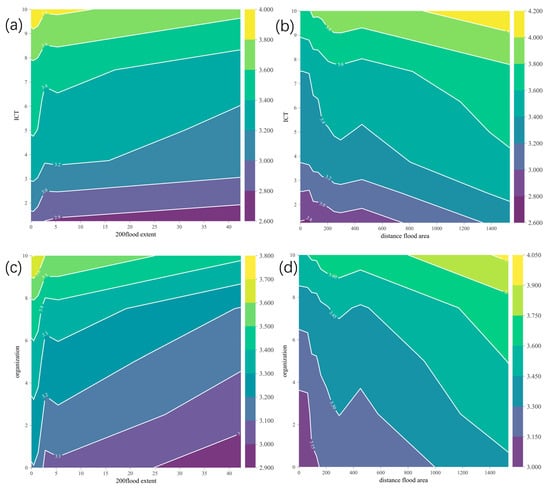 To gain a deeper understanding of how urban flood inundation affects residents’ participation in disaster relief, this section explores the interaction effects between flood severity and other key factors. Figure 5 reveals a significant synergistic interaction between communication technology and both flood severity indicators (Figure 5a,b). Specifically, residents’ participation is greatest when high levels of communication technology are combined with conditions of lower risk (i.e., minimal surrounding inundation and greater distance from flooded areas). A parallel synergistic effect is observed for government organizational work (Figure 5c,d), where its positive impact is most pronounced under similar low-risk conditions. This synergy can be understood as the interplay between risk signals and support signals. Flood severity acts as an intuitive risk signal. When this threat diminishes, it works in concert with the positive information and mobilization capacity provided by communication technology and government organizations, resulting in a substantial enhancement of residents’ participation.