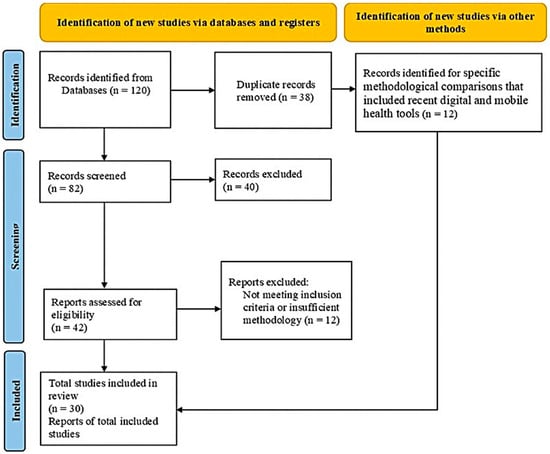 This systematic review was conducted in accordance with the Preferred Reporting Items for Systematic Reviews and Meta-Analyses (PRISMA) 2020 guidelines [9]. A structured search was performed to identify peer-reviewed articles published between January 2003 and March 2025. Studies from 2014 onward were given additional priority to reflect the methodological shifts associated with the rapid expansion of mobile health technologies, wearable devices, and telehealth platforms [10].