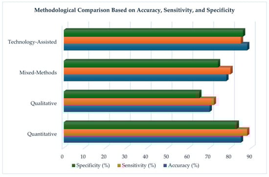 Qualitative methods were used in 6.7% (n = 2) of studies and provided rich insights into sociocultural and emotional influences on self-management behaviors. For example, Refs. [35,38] examined how generational dietary norms, family dynamics, and food beliefs shaped self-management in specific communities. These studies commonly targeted dietary behaviors (100%) and medication adherence (50%), using thematic analysis and semi-structured interviews. While qualitative methods achieved 70% accuracy, 72% sensitivity, and 65% specificity, their smaller purposive samples limited generalizability. Nevertheless, they were critical for capturing cultural nuance and behavioral motivations often missed by quantitative methods [42]. It is important to note that some reported metrics were estimated based on methodological characteristics rather than directly extracted from studies, and these values should therefore be interpreted with caution.