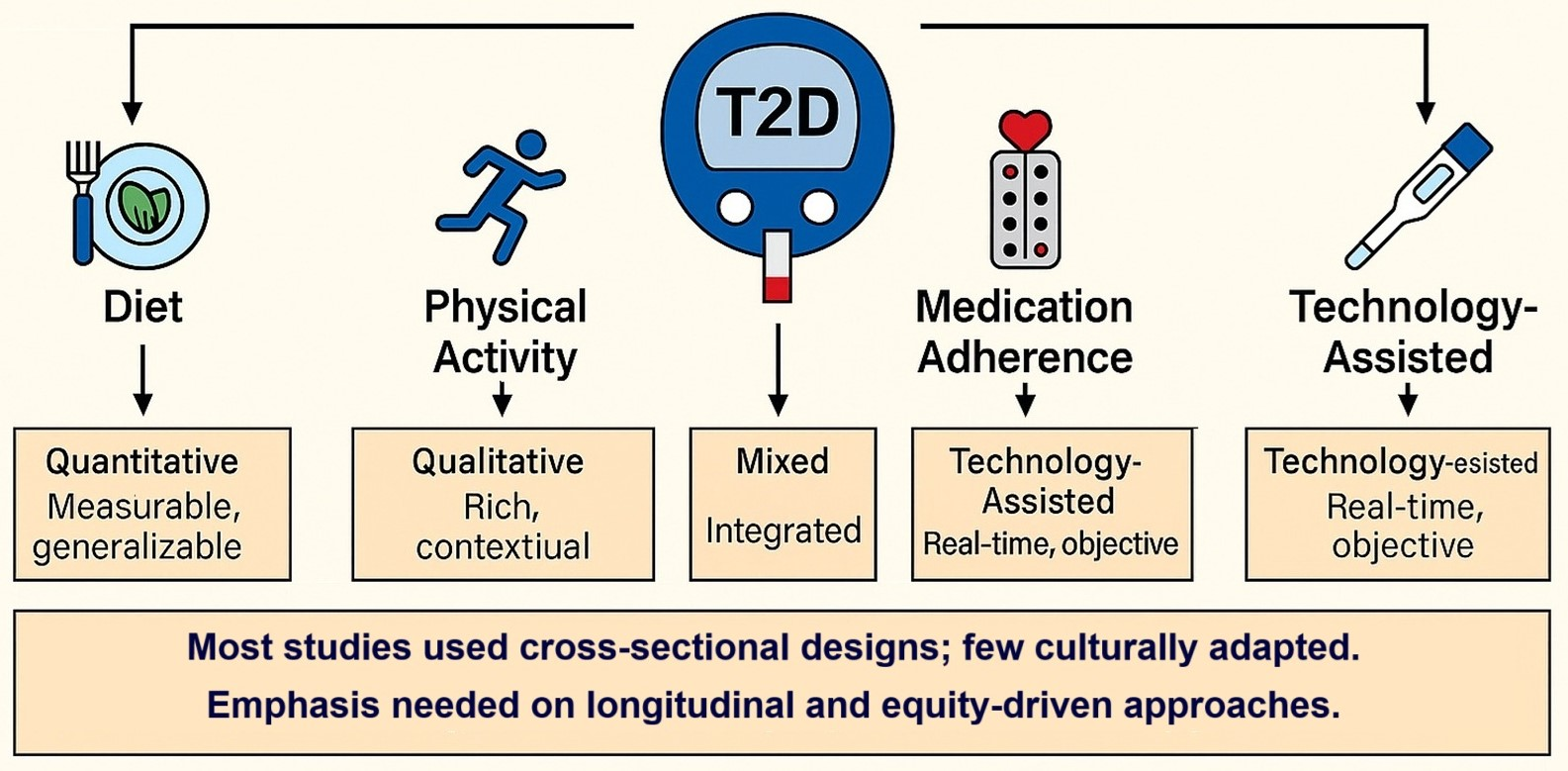 T2DM is a leading global public health challenge, characterized by chronic hyperglycemia due to insulin resistance and impaired insulin secretion [1]. Accounting for more than 90% of all diabetes cases, T2DM is strongly linked with obesity, physical inactivity, and rapid nutritional transitions worldwide. Effective management requires sustained engagement in self-care behaviors, including adherence to dietary guidelines, regular physical activity, medication use, and self-monitoring of blood glucose. Inadequate adherence to these behaviors contributes to poor clinical outcomes, diminished quality of life, and growing healthcare costs [2]. Research into T2DM health behaviors has expanded substantially in recent decades, employing diverse methodological approaches such as quantitative surveys, qualitative interviews, mixed-methods designs, and, more recently, digital health technologies. Each approach provides unique insights but also presents limitations, creating challenges for comparability and translation of findings into public health practice [3].