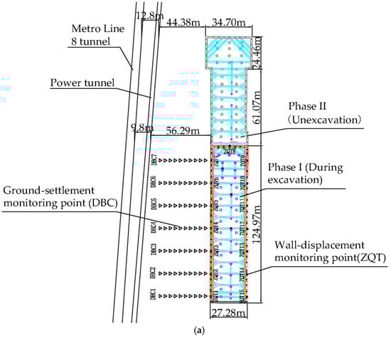 During Phase I excavation, real-time monitoring was conducted using a variety of instruments, including 40 wall displacement monitoring points (ZQT) installed at 1 m intervals, 40 ground settlement monitoring points (DBC) at 2 m intervals, and 28 tunnel displacement measurement sections spaced every 10 m, as illustrated in Figure 1a.