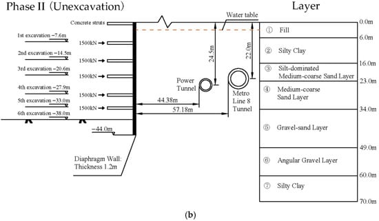 Site layout and geological cross-section of the excavation. (a) Plan view illustrating Phase I (during excavation), Phase II (unexcavated), adjacent power tunnels, and Metro Line 8 tunnels, along with monitoring locations. (b) Cross-sectional view of the excavation depicting subsurface stratigraphy, groundwater level, diaphragm wall and strut elevations, as well as the relative positions of the two tunnels.