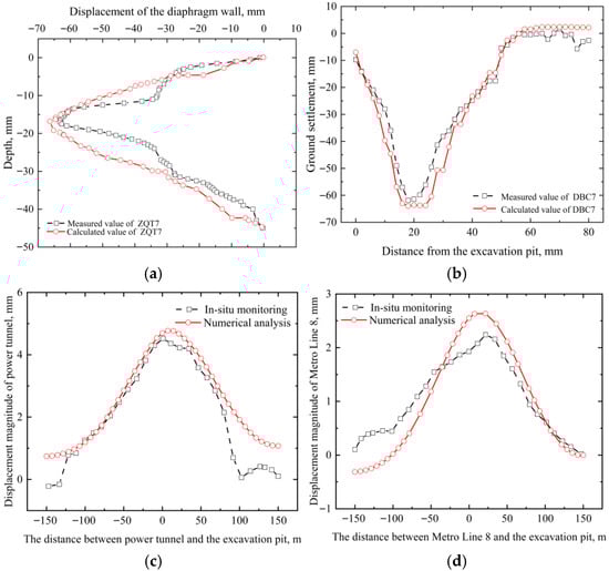 Comparison between field measurements and numerical simulations near the excavation (Phase I): (a) Lateral deflection of the diaphragm wall at section ZQT7 as a function of depth; (b) Ground settlement at section DBC7 as a function of distance from the pit; (c) Displacement of the power tunnel as a function of distance from the pit; (d) Displacement of Metro Line 8 tunnel as a function of distance from the pit.
