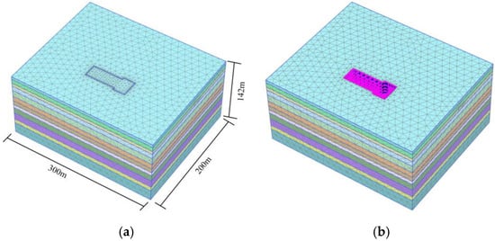Finite element numerical analysis model: (a) Before excavation. (b) After excavation.
