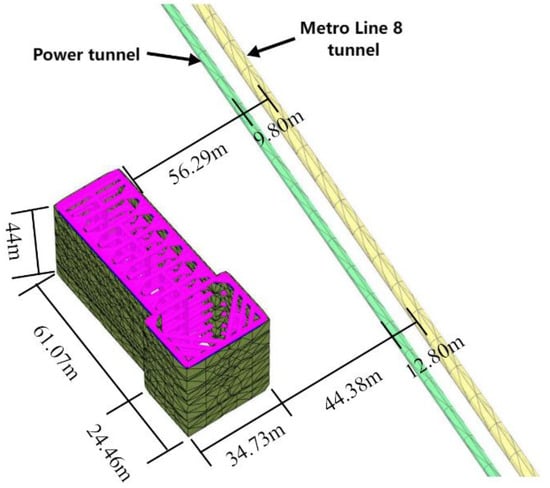 According to Saint-Venant’s principle, which indicates that the influence zone extends approximately 2.5 times the excavation depth, the overall model size was set to 300 m (X) × 250 m (Y) × 142 m (Z) to minimize boundary effects. As shown in Figure 3, the soil domain was discretized using a swept mesh with “fine” element density to ensure computational accuracy, resulting in a total of 17,584 elements and 70,377 nodes. All four vertical boundaries were constrained against normal displacement, while the base of the model was fixed in all directions to simulate realistic boundary conditions. The relative position between the excavation pit and the tunnels is presented in Figure 4.