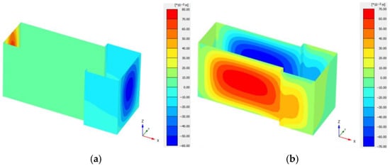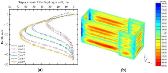 Figure 5 presents the horizontal displacement contours of the diaphragm wall in both the X and Y directions after excavation. The wall exhibits a relatively uniform inward deformation pattern, with the maximum horizontal displacement observed at the mid-height section. Specifically, the peak displacements along the long and short sides of the excavation are 66.49 mm and 61.36 mm, respectively, accounting for only 0.018% of the excavation depth. These values are considerably below the deformation control limit of 0.2% H specified in the Technical Code for Building Foundation Pit Support (DB11/489-2016) [25] and the Code for Design of Urban Rail Transit Engineering (DB11/995-2013) [26]. The results demonstrate that the diaphragm wall ensures structural safety and maintains stability throughout the excavation process.