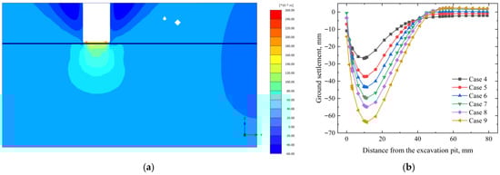 Figure 7a presents the settlement contours of the surrounding soil after excavation. The maximum settlement occurs near the excavation edges, particularly around the diaphragm walls, forming a characteristic funnel-shaped profile with a peak value of approximately 79.14 mm. At the excavation base, soil heave also exhibits a funnel-like shape, reaching a maximum of about 177.69 mm and gradually decreasing with distance from the pit center. These observations indicate that vertical deformation is primarily concentrated at the excavation boundaries and base, respectively, with both settlement and uplift diminishing progressively outward, reflecting the localized influence of excavation on soil movement.