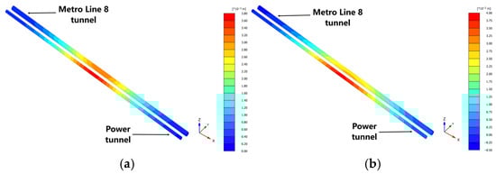 Figure 2c,d indicate that tunnel displacements are greatest near the excavation and diminish with increasing distance. The power tunnel exhibits a maximum displacement of 5.12 mm, which is higher than the 2.24 mm observed for Metro Line 8, reflecting both its closer proximity to the excavation and its relatively lower lining stiffness.
