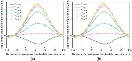 Figure 8 and Figure 9 present the displacement cloud map and overall displacement curves of the existing tunnels after excavation is completed. In Figure 9, the horizontal axis is referenced from the point on the tunnel closest to the excavation site. These figures demonstrate that the foundation pit excavation induces displacement in both the power tunnel and Metro Line 8 tunnel. Moreover, the overall displacement of both tunnels increases progressively with excavation depth.