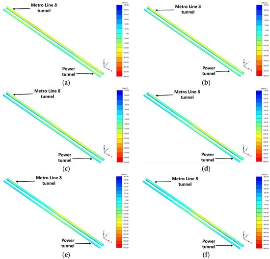 Figure 10a–f demonstrates that as the excavation depth increases, the maximum shear stress in the Metro Line 8 tunnel lining—nearest to the excavation pit—rises from −237.19 kPa to −548.64 kPa. Similarly, in the power tunnel lining, shear stress increases from −126.57 kPa to −383.94 kPa. These variations indicate progressive soil stress relief and intensified shear deformation near the excavation area.