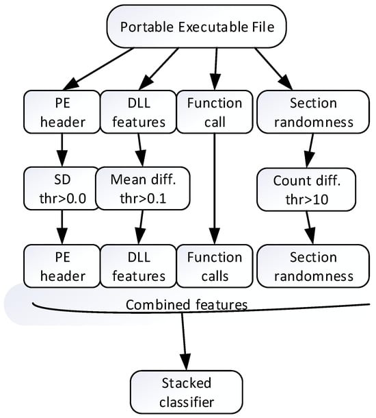To improve the efficiency of the method, the initial feature set is decreased by applying the method of threshold. The use of a threshold enables elimination of features with little information. Several types of threshold, depending on feature set, were applied. A standard deviation (SD) threshold was applied to the PE header. A mean difference threshold was applied to the usage of DLLs in ransomware and benign software. A count difference threshold was applied to the usage of sections in ransomware and benign software. The resulting feature sets are then joined into a single comprehensive static feature set.