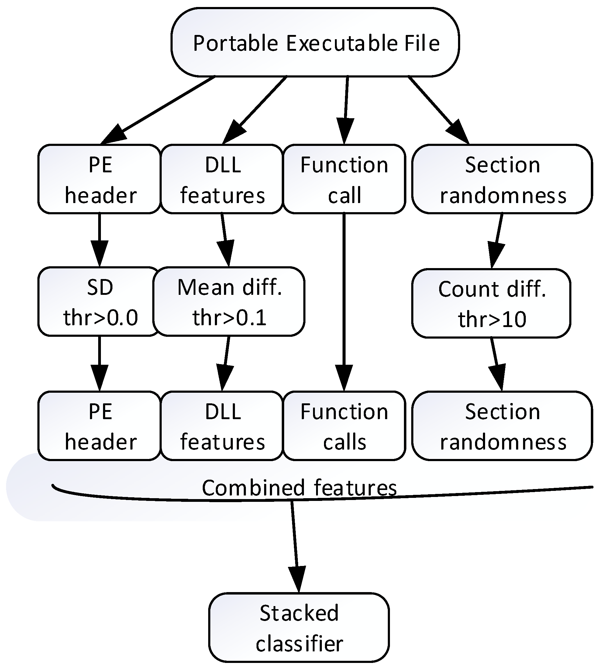 To improve the efficiency of the method, the initial feature set is decreased by applying the method of threshold. The use of a threshold enables elimination of features with little information. Several types of threshold, depending on feature set, were applied. A standard deviation (SD) threshold was applied to the PE header. A mean difference threshold was applied to the usage of DLLs in ransomware and benign software. A count difference threshold was applied to the usage of sections in ransomware and benign software. The resulting feature sets are then joined into a single comprehensive static feature set.