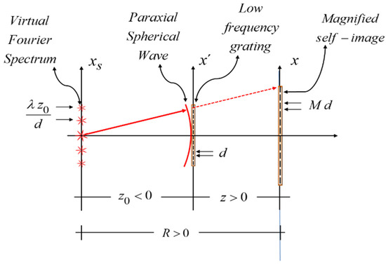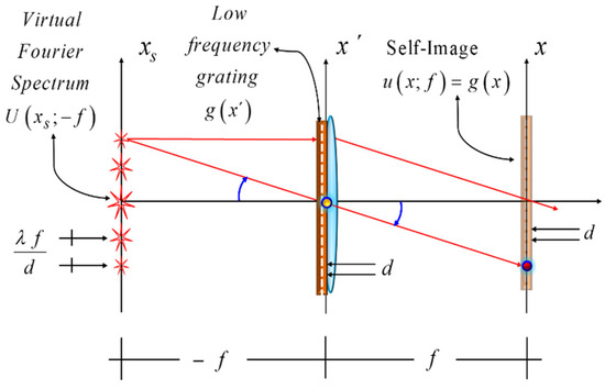As depicted in Figure 2, the grating is located at the lens. Next, we show that out of the virtual Fourier spectrum, one can obtain a self-image of the grating. For this goal, we note that the virtual Fourier spectrum of the grating is located at the front focal plane of the lens. Since the lens performs optically a Fourier transform, then at the back focal plane of the lens, one can obtain a self-image of the grating. In mathematical terms, we evaluate Equation (7) for the case z0 = −f, then