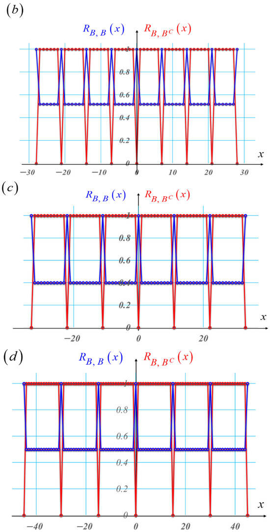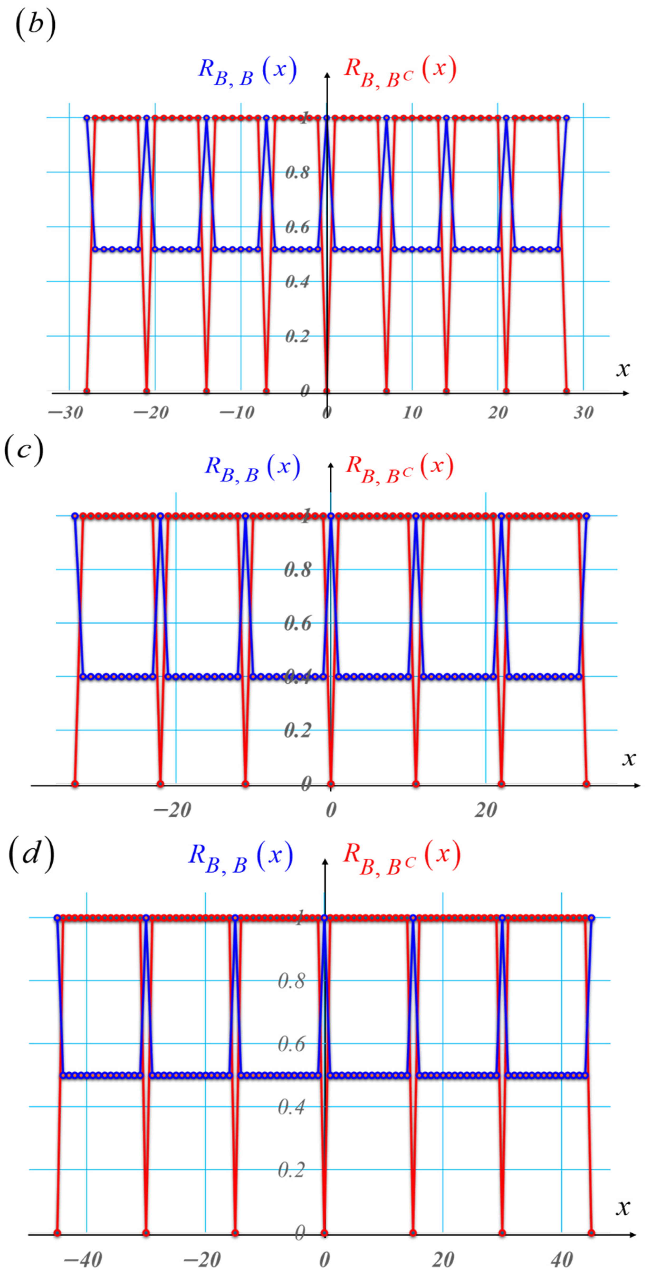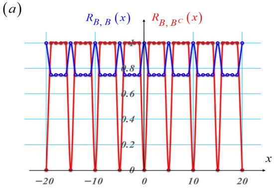 In Equation (20), the upper-case letter “L” stands for the length of the Barker sequence. As before, the lower-case Latin letter “d” denotes the period of the grating. And the letter Bn denotes the values of the white and black Barker sequence of length L, as in Table 1.