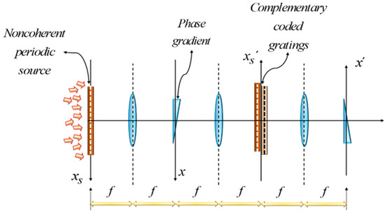 The schematic depicts the conditions that are shown in Figure 2 and Figure 4. But now, at the back focal plane of a positive lens, we consider the superposition of two binary gratings. The initial grating is under noncoherent illumination. It is located at the front focal plane of the positive lens. The initial grating has transparent windows that coincide with the positions of the virtual Fourier spectrum of the second grating. This later grating is in close contact with a positive lens.
