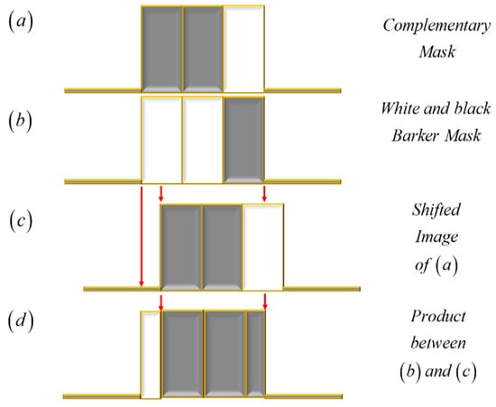 Illustration depicting the product of two binary complementary masks. In (a), a mask is coded with the complementary sequence {0,0,1}. In (b), the mask is coded with the white and black Barker sequence {1,1,0}. In (c), a laterally shifted image of the mask is in (a). In (d), the product of the masks is in (b,c).