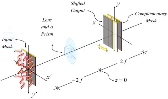 Imaging device for implementing the mathematical operation in Figure 2, for two complementary binary masks. At the X–Y plane, the initial masks is laterally shifted due to the presence of the prism, which is located at the imaging lens. The complementary mask is coded with the Barker sequence of length L = 3.