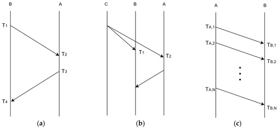 S-R synchronization mechanism is implemented through a bidirectional handshake between two nodes, exemplified by the Timing-sync Protocol for Sensor Networks (TPSN) [20]. As shown in Figure 2a, Node B sends a message timestamped at its local clock time T1, which is received by Node A at time T2. At time T3, Node A replies with an acknowledgment containing timestamps T2 and T3. When the packet is received by Node B at T4, the clock offset and propagation delay are determined according to Equation (1). Using the estimated offset, Node B adjusts its local clock to synchronize with Node A’s clock.