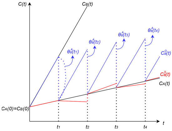 Figure 3 illustrates the process wherein Node B synchronizes its clock with that of Node A. For conceptual simplicity, it is presumed that both clocks start from identical initial values. However, due to unique oscillator frequencies at each node, the clock offset between the two nodes progressively increases. When Node B computes the relative offsets and applies offset compensation at time instances t1, t2, t3, and t4, its synchronized clock is represented as . Because this approach overlooks clock drift, CB(t) steadily diverges from CA(t) at a fixed rate. Extending the interval between synchronization events increases the resultant error. However, excessively frequent synchronization incurs significant communication and energy overhead, hence it is often undesirable despite improved accuracy.