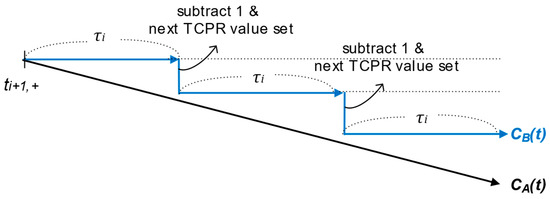 Initially, the relative clock skew can be computed or estimated only when Node B stores the offset-correction timestamps based on its local clock. Due to the clock adjustment that occurs during offset compensation, Node B’s clock experiences discontinuities, resulting in two distinct timestamp values for each synchronization event. Let us denote these as ti,− and ti,+ representing the local clock time immediately before and after the offset correction, respectively. These two values are related by