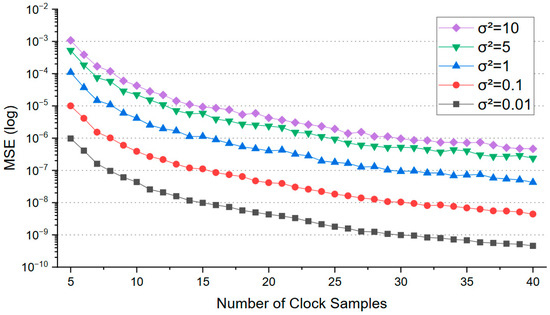 In real-world scenarios, the interval between timing message exchanges for offset compensation may not be strictly periodic. Under conditions where exchange intervals remain constant, the variance of relative skew measurements remains uniform, enabling straightforward application of the RLS estimator. However, when timing intervals vary, these variances become unequal across observations. Notably, as shown in Equation (10), longer intervals between synchronization events correspond to reduced variance in skew estimates. The variance of the i-th relative skew estimate is quantified by