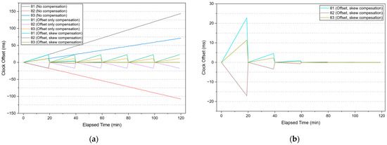Clock offset variation in three nodes relative to the reference node over elapsed time: (a) Clock offset measurements under three scenarios: “No compensation,” “Offset only compensation,” and “Offset, skew compensation”. (b) Detailed view of the “Offset, skew compensation” scenario with enhanced y-axis resolution.