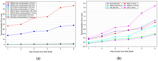 To analyze the impact of clock skew with respect to hop count, experiments were first performed applying only offset compensation, as in standard TPSN. Each node executed offset compensation at intervals of 30 min or 1 h. The synchronization error data collected from all nodes were averaged based on their hop count relative to the sink node. As shown in Figure 10a, the average synchronization error in the “Offset only compensation” case tends to increase slightly with hop count, and the influence of clock skew on synchronization error becomes more pronounced as the interval between compensations increases.