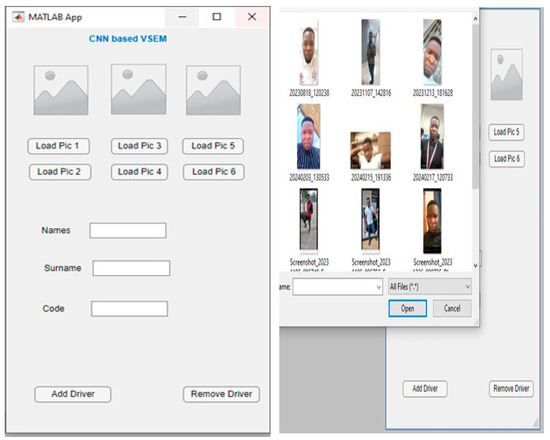 Driver registration within the proposed CNN-based Vehicle Security Enhancement Model (VSEM) is facilitated through a dedicated mobile application and is executed in two primary stages: facial image acquisition and form submission. In the initial stage, users are required to upload six distinct images of the driver’s face as illustrated in Figure 4 below.