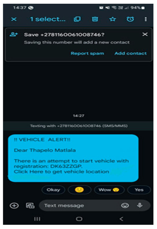 Simultaneously with the identification event, the system dispatches an SMS alert to the registered vehicle owner. The message includes the vehicle’s registration number and a clickable link, as shown in Figure 7, to access location information.
