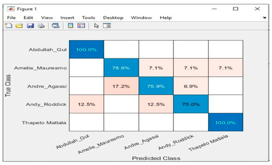 To provide a more granular evaluation of the model’s performance, the paper examined classification accuracy at the individual subject level. Figure 9 below presents the confusion matrix summarizing the CNN-based VSEM’s classification outcomes across five identities: Abdullah Gul, Amelie Mauresmo, Andre Agassi, Andy Roddick, and Thapelo Matlala.