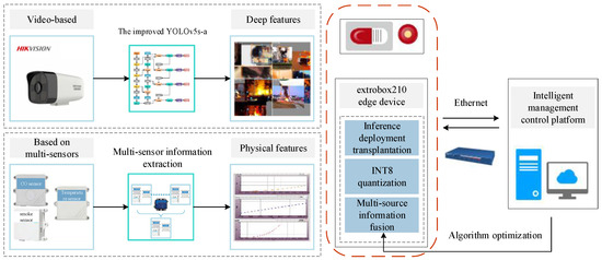 The proposed system architecture, as illustrated in Figure 1, consists of four core components: (1) a video detection module, (2) a multi-sensor module, (3) an edge computing unit, and (4) an intelligent management platform. The video-based fire detection algorithm and multi-sensor data fusion algorithm are deployed on an Extrobox210 edge computing device. This setup facilitates direct communication between surveillance cameras and the edge device, enabling offline detection while ensuring real-time monitoring of the underground mining environment. Processed monitoring data is transmitted via Ethernet to the intelligent management platform, enabling operators to monitor the working environment in real-time and issue operational commands as needed. The subsequent sections will elaborate on the detailed design of the video detection and multi-sensor modules, including hardware selection criteria and deployment parameters.