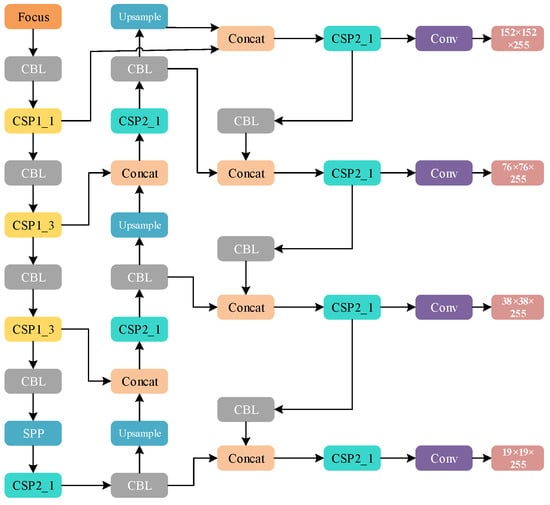 YOLOv5s uses the fusion method of three scales (76 × 76, 38 × 38, 19 × 19) in multi-scale detection. The feature scale with the smallest resolution is 76 × 76, corresponding to the input 608 × 608, and the receptive field of the feature map is 608/76 = 8 × 8. Considering the requirements of flame detection accuracy and speed, this paper adds a 152 × 152 feature scale and improves it to four-scale detection. At this time, the corresponding receptive field is 4 × 4, which fully learns the shallow features and improves the small-target detection performance. The improved network model is shown in Figure 3.
