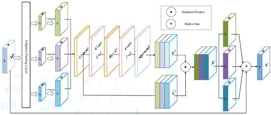 Firstly, the extracted feature map M5 (with dimensions S = h × w) is processed through an adaptive average pooling layer to obtain multiple context features at different scales (a1 × S, a2 × S, a3 × S). The pooling coefficient a can be adaptively changed according to the target size in the dataset, and the value range is [0.1, 0.5]. Secondly, each feature map is upsampled, and the sampled feature map is merged through the concat layer to obtain the feature map C5. The characteristic diagram formula of the m-th output channel of concat layer output as (1)