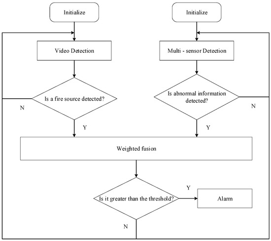 The system fuses data from the camera and multiple sensors using a weighted algorithm and compares the result to a predefined threshold to determine whether to trigger an alarm. The decision-making process is dynamic: when the camera detects a potential fire, its output and any abnormal sensor readings are assigned different weights, summed, and evaluated against the threshold. If the result exceeds the threshold, an alarm is triggered; otherwise, monitoring continues. The full process is illustrated in Figure 6.
