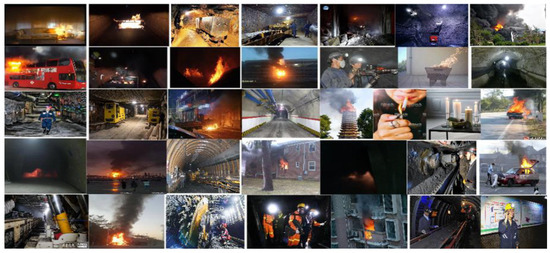 To improve the performance of the coal mine flame detection model, a combustion dataset was constructed to simulate the underground environment. This dataset contains 9000 images that capture the entire process of flame combustion from early stages to complete development and ultimately extinguishing. There are a total of 2841 fire images and 6159 non-fire images, including road lighting, searchlights on workers’ heads, lights, etc., which have characteristics similar to flames and are unrelated to flames, such as rock excavation machines, hydraulic anchor drills, scraper conveyors, etc., as shown in Figure 8.