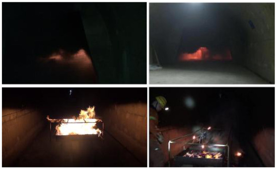 To more accurately simulate the underground environmental conditions in coal mines [23], the dataset for this study was collected in simulated tunnels. Before conducting the combustion experiment, the environmental humidity was controlled at 80%, the visibility was 20 m, and the total dust concentration was set to 25–50 mg m−3 to ensure the rigor of the experimental dataset. The image of the simulated tunnel is shown in Figure 9. Meanwhile, the camera’s shooting angle and other parameters were carefully adjusted to ensure consistency with the actual underground scene. In the tunnel, the closer to the excavation face, the higher the total dust concentration. This study setup cameras at different positions, under different lighting conditions, and with different total dust concentrations to collect data. The specifications of the dataset shooting parameters are detailed in Table 4.