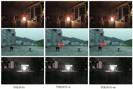 Notably, YOLOv5s-as—the proposed detection method in this paper—exhibited a slightly slower inference speed compared to YOLOv5s. This is because the proposed approach integrates sensor data with video-based detection, resulting in a marginal increase in processing time. Nevertheless, it achieved a 7.2% improvement in detection accuracy. Additionally, compared to the pre-deployment YOLOv5s model, YOLOv5s-as demonstrated a 17% increase in inference speed, further validating the superiority of the proposed detection method. Meanwhile, due to YOLOv5s-as adopting a multi-source data fusion approach, it can effectively detect any period of fire occurrence, ensuring the stability of the proposed method.