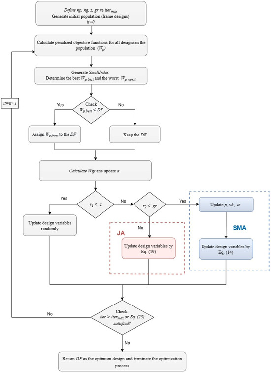 i. The formulations of SMA and JA were modified to enhance the hybrid algorithm’s search capability and reduce the number of analyses required in the optimization process.