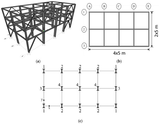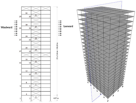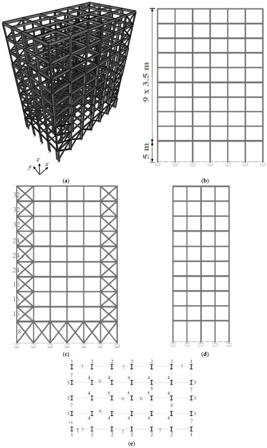 Young Modulus is 200 GPa, yield stress () is 248.2 MPa, and the unit weight is 7.85 t/m3. The design constraints were considered by the AISC-LRFD [52]. In addition to the original paper, which first optimized these examples, the geometric constraints of the beam-to-column connection were also considered. A discrete profile list comprising 268 standard wide-flange sections from AISC was utilized to size the cross-sectional areas of the structural members during the optimization process. Ten load combinations, including earthquake effects according to ASCE7-98 [62], ref. [62] are implemented in the design of space frames [34].