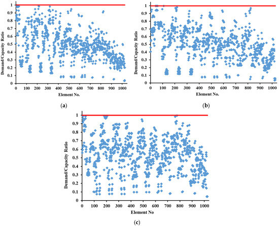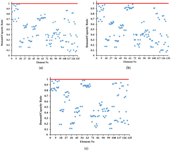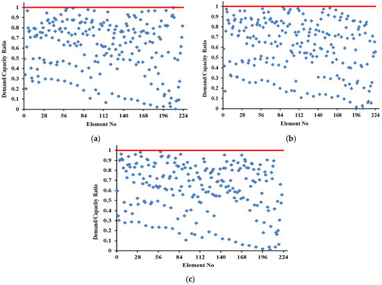 Strength ratio of the members of the 1026-member braced space frame evaluated for the optimized designs of (a) JA, (b) SMA, and (c) HSMJA-ODC.