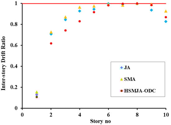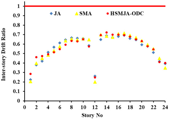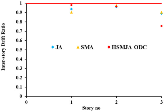 Figure 13 and Figure 14 present the strength ratios of the frame members and inter-story drift ratios evaluated for the optimized designs of HSMJA-ODC, JA, and SMA. HSMJA-ODC designed more “nearly critical” members, for which the strength and drift ratios are almost equal to 1, compared to JA and SMA, thus reducing the structural weight of the optimized frame compared to that achieved by the component algorithms.