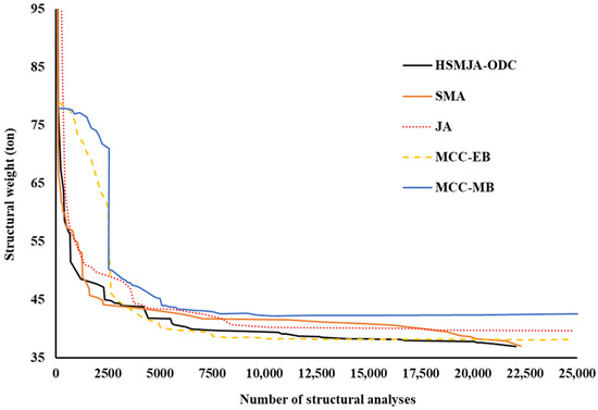 Regarding the component methods of HSMJA-ODC, two distinct behaviours are highlighted in Figure 9. Intermediate designs generated by JA initially yield a rapid reduction in structural weight. Yet, the convergence rate of this algorithm significantly decreased between 1500 and 24,000 structural analyses. The convergence curves of SMA and JA remained close enough until approximately 25,000 structural analyses. Still, the former algorithm then generated intermediate designs that were much closer to those of HSMJA-ODC than in the case of JA.