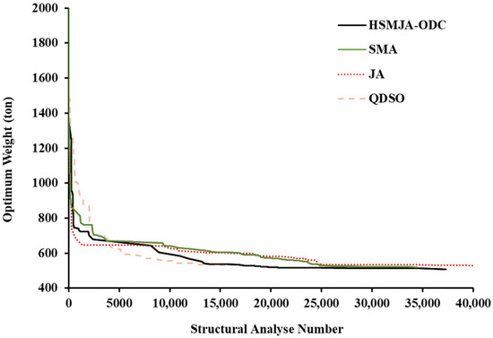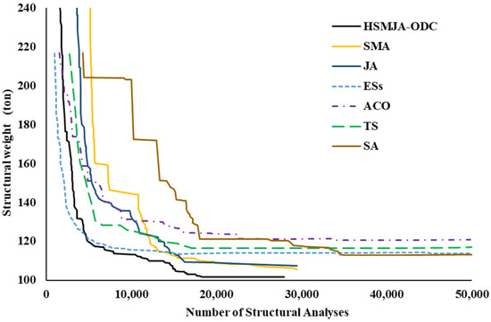 The proposed HSMJA-ODC algorithm yielded the lightest design among the methods reported in Table 4, weighing 508.43 tons, after 37,278 structural analyses (well below the theoretical computational budget of (Np × itermax) = 40 × 1250 = 50,000 structural analyses mentioned in Section 8.1). The proposed method’s component algorithms, SMA and JA, also converged to feasible designs weighing 520.74 ton and 528.72 ton, respectively, after 34,413 and 39,946 structural analyses (again below the theoretical computational budget of 50,000 analyses). Remarkably, HSMJA-ODC found a feasible intermediate design lighter than the SMA’s optimum design (i.e., only 520.73 ton vs. 520.74 ton) after only 19,569 structural analyses, thus confirming its superiority over SMA in terms of computational speed. SMA and JA methods are the 4th and 5th ranking in terms of optimized weight among all methods reported in Table 4.