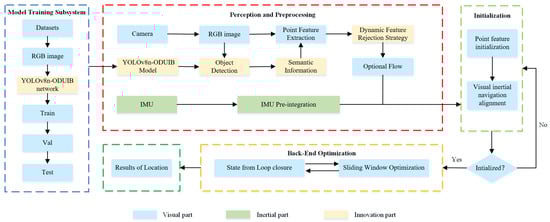 The proposed system is built upon the VINS-Fusion framework, which is widely regarded as one of the most comprehensive and robust open-source visual-inertial SLAM algorithms. Leveraging VINS-Fusion as the core infrastructure enables YSAG-VINS to achieve reliable global localization. As depicted in Figure 1, the overall architecture of YSAG-VINS comprises three principal components: Model Training Subsystem, Perception and Preprocessing, Initialization, and Back-End Optimization.
