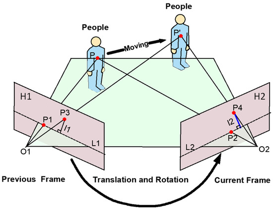 According to the pinhole camera model, let the camera centers of two image frames be O 1 and O 2 . The plane determined by the spatial point P and these two camera centers is the epipolar plane. The image planes H 1 (previous frame) and H 2 (current frame) intersect this epipolar plane to form the epipolar lines L1 and L2, respectively. The projection of P on H 1 is P 1 , its theoretical projection on H 2 is P 2 , while the projection of the displaced spatial point P (caused by camera motion or target displacement) on H 2 is P 4 , as illustrated in Figure 5.