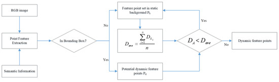 Figure 6. Flowchart of the dynamic feature rejection strategy based on the epipolar constraint with a dynamic threshold.