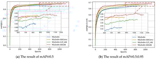 To further evaluate the recognition accuracy of the proposed object detection algorithm, a time-series analysis of the mAP@0.5 and mAP@0.5:0.95 metrics across training epochs was conducted for all four experimental groups. Figure 7 shows the time-series results of mAP@0.5 and mAP@0.5:0.95 for the four Group. In Figure 7, it is evident that Group 1 (baseline YOLOv8n) consistently exhibits the lowest performance in both mAP@0.5 and mAP@0.5:0.95 throughout the training process, with values gradually stabilizing as the number of epochs increases. Group 2, which incorporates the ODConv module, achieves higher detection accuracy than Group 1 across most of the training period. Notably, during the 700–900 epoch range, Group 2 temporarily surpasses the proposed method in terms of mAP@0.5. However, signs of overfitting begin to emerge in Group 2 beyond epoch 850, leading to a relative decline in performance. Group 3, integrating the UIB structure in place of the C2f module, demonstrates relatively stable performance throughout training, but its final accuracy remains slightly below that of Group 2. In contrast, the proposed method (Group 4), which combines both the ODConv and UIB modules, consistently outperforms the other three configurations in terms of both mAP@0.5 and mAP@0.5:0.95 in the later training stages. Specifically, the proposed method achieves an mAP@0.5 of 92.6%, and under the stricter IoU threshold conditions, reaches an mAP@0.5:0.95 of 68.1%, representing a 6.9% improvement over the baseline model in Group 1. These results demonstrate the effectiveness of the dual-module integration strategy in enhancing detection accuracy while maintaining robustness throughout the training process.