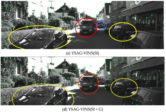 In Figure 11a, the feature points extracted by VINS-Fusion do not account for dynamic and potential dynamic objects in the scene. As a result, the extracted feature points come from static objects, dynamic objects, and potential dynamic objects. The feature points extracted from dynamic objects will affect the system’s position estimation accuracy. Figure 11b shows the result of the feature points extraction by YSAG-VINS (S) that the semantic information from the original YOLOv8n model is used. The dynamic objection (marked in red cycle) and most potential dynamic objects are identified, while one potential dynamic object marked in blue cycle is still undetected. The feature points from the identified dynamic and potential objects are removed, while some feature points are extracted from the undetected potential dynamic object. Figure 11c is the result of the feature points extraction by YSAG-VINS (SI), and the undetected potential dynamic object in Figure 11d is also detected by the improved semantic model. The feature points from the dynamic and potential dynamic objects are successfully removed. However, in scenes with a large number of potential dynamic objects, removing all the feature points of potential dynamic objects will result in an insufficient number of usable feature points, thereby affecting the accuracy and stability of the system’s position estimation. Figure 11d is the result of the feature points extraction by the proposed algorithm (YSAG-VINS (SI+G)), and all the dynamic and potential dynamic objects are detected. For the proposed algorithm, the feature points from dynamic objects are removed, while the feature points from robust potential dynamic objects are retained as much as possible. This will enable more reliable feature points to be extracted from the scene, thereby enhancing the reliability of the system’s position estimation.